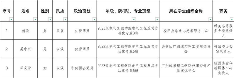 根据《关于开展2024-2025年度广州城市理工学院学生会组织先进集体和优秀个人评选工作的通知》要求,由各学生组织遴选推荐,经学院审查材料、并审核,现将电气工程学院2024-2025年度广州城市理工学院优秀学生骨干初审的拟推报名单予以公示。现将名单公示如下: