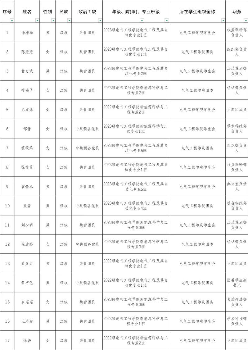 电气工程学院各年级各班、学生组织: