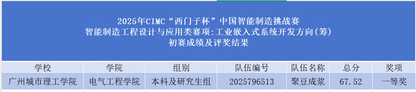 7月20日,2025年CIMC“西门子杯”中国智能制造挑战赛(初赛)公布赛果。在工业嵌入式系统开发赛项中,我校电气工程学院参赛队伍依靠扎实的专业知识和实践创新能力脱颖而出,获得初赛一等奖。