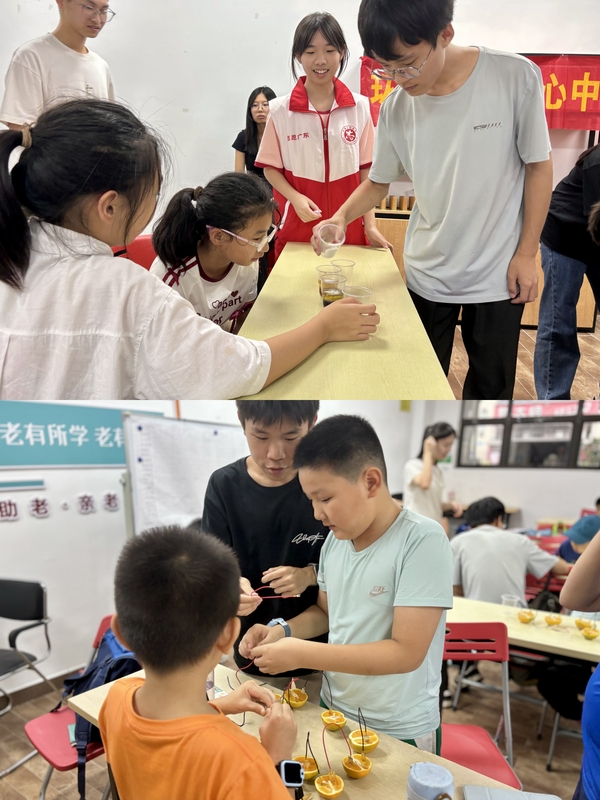 科学探索模块,实践团成员准备了一系列科学性与趣味性兼具的实验课程。水果电池实验中,成员们将不同水果与金属片巧妙组合,让同学们亲眼见证化学能如何转化为电能,观察电流产生的瞬间。模拟火山爆发实验,成员们以常见的化学物质混合,模拟出瞬间喷发的“岩浆”。虹吸原理演示环节,成员们通过精心设计的装置,水流在管道中逆流而上,让同学们明白背后物理原理的同时,也在同学们心里种下了科技启蒙的种子。