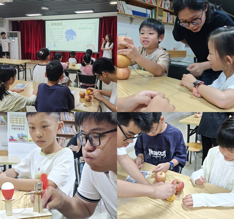 7日,团队走进了龙湖区新津街道,为社区孩子们开展了一场科普活动。活动中,队员们带领孩子们动手操作两个实验:一是利用水果中的化学能制作“水果电池”点亮小灯泡;二是组装简易风力发电机模型,观察风力如何驱动叶片转动并产生电能。通过实验,让孩子们在动手的过程中掌握科学原理。