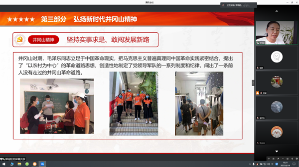 为庆祝中国共产党成立100周年,弘扬习近平新时代中国特色社会主义思想,进一步推进党史学习教育在基层的深入开展、落地有效,落实学院党员领导干部讲党课。2021年6月14日下午13点,电气工程学院党总支于线上腾讯会议召开了“弘扬井冈山精神、做新时代电气人”专题党课学习会。本次党课由电气工程学院副院长郭培虹主讲,电气工程学院全体师生党员参与学习。